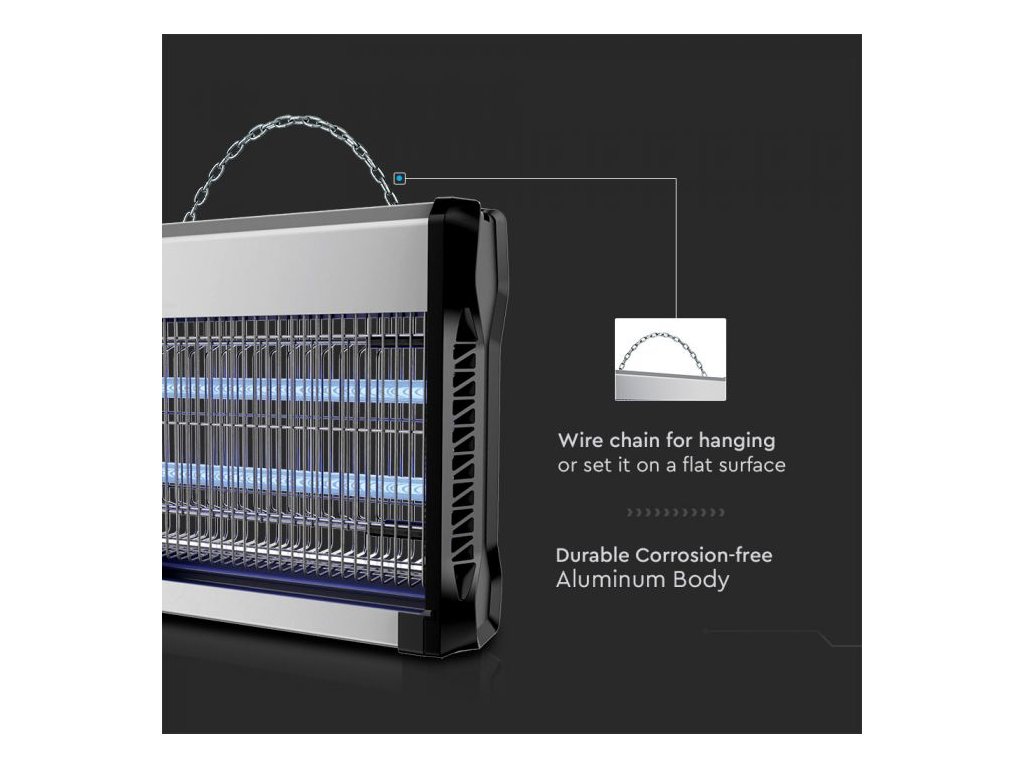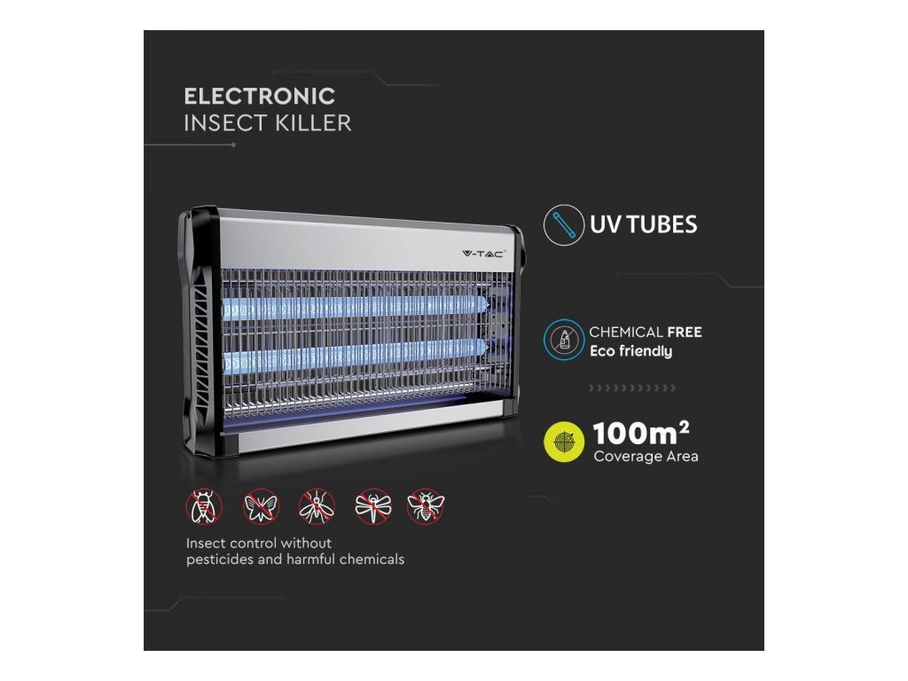 Elektronický lapač hmyzu s dvojitými 15W UV trubicami efektívne priťahuje a ničí lietajúci hmyz. Pokryje plochu až 100 m² a je vhodný pre interiér aj exteriér. Jednoduchá údržba vďaka odnímateľnej tácke na zber mŕtveho hmyzu.