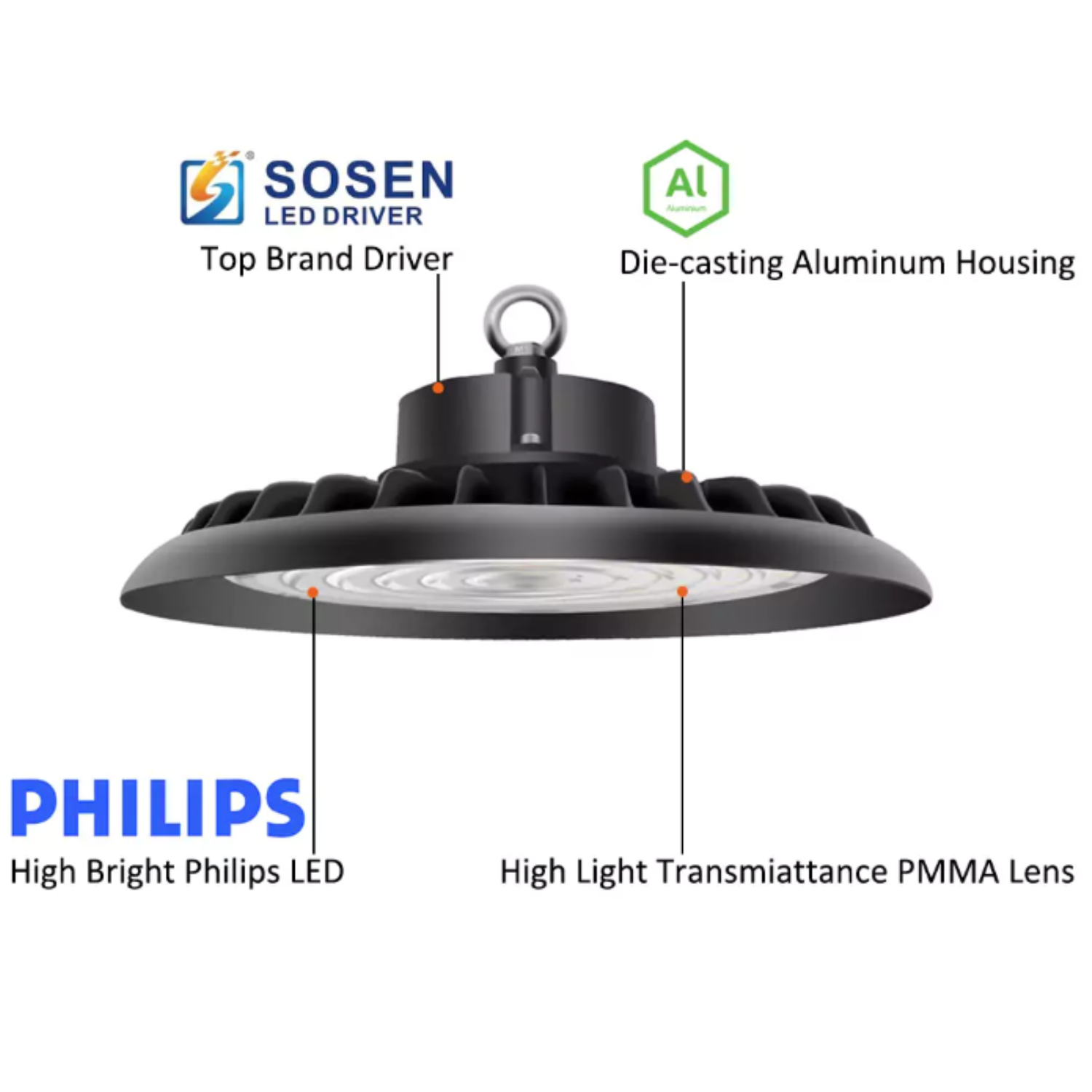 UFO Highbay svietidlá série UCU3 využívajú vysoko svietivé čipy Philips LED s účinnosťou >150 lm/W a spoľahlivé Sosen napájanie. Telo z liateho hliníka zaručuje efektívne chladenie a dlhú životnosť. K dispozícii je stmievanie 1–10 V alebo DALI a voliteľný núdzový modul (25 W / 40 W) s výdržou až 3 hodiny – ideálne riešenie pre haly, sklady a priemyselné priestory.