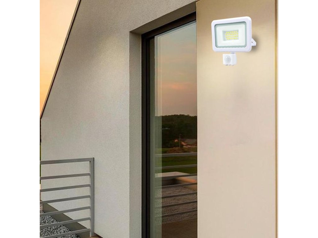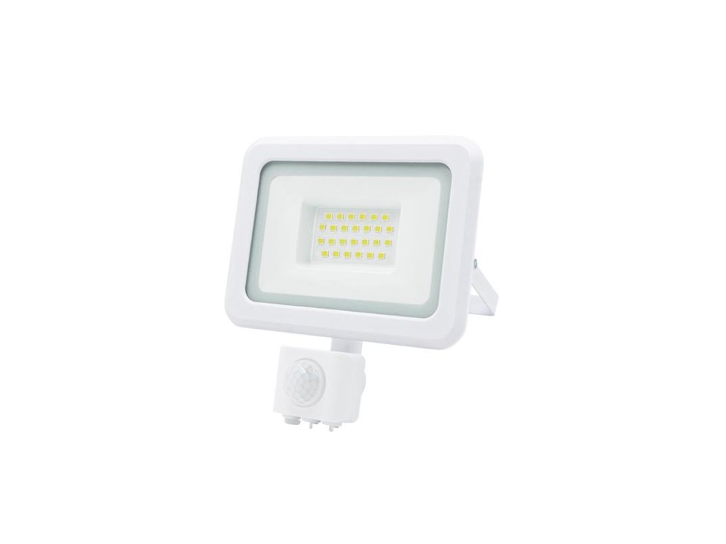 Vonkajší biely LED reflektor NEDES 20 W s PIR senzorom, 1600 lm, neutrálna biela 4000 K, krytie IP44. Úsporné, odolné osvetlenie pre dvor, garáž, záhradu.
