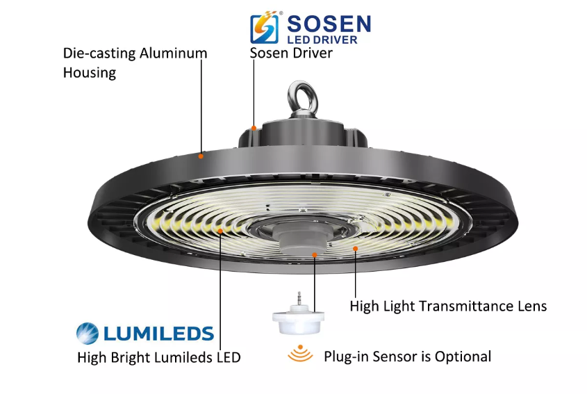 Výkonné LED UFO svietidlo 100W je ideálnym riešením pre profesionálne osvetlenie priemyselných a komerčných priestorov. Vďaka vysokej účinnosti až 180 lm/W, spoľahlivým komponentom Lumileds + Sosen a možnosti doplnenia inteligentných senzorov ponúka maximálnu efektivitu, úsporu energie a flexibilitu použitia.