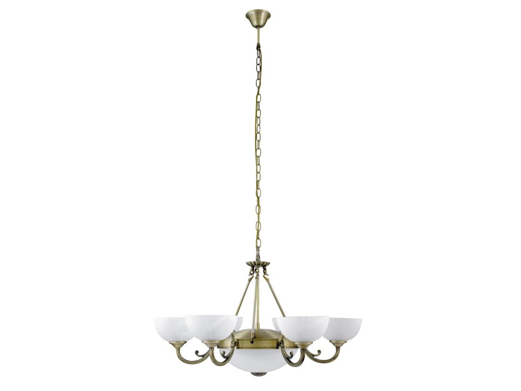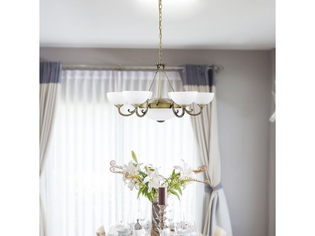 Klasické lustre Marlene s bronzovým prevedením a bielym alabastrovým tienidlom vhodné do obývačky, jedálne alebo spálne. Kombinácia objímok E14 a E27 poskytuje flexibilné osvetlenie s dlhou životnosťou.