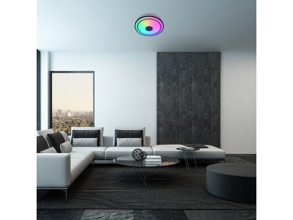 Moderné stropné svietidlo Nikolaus s nastaviteľnou farebnou teplotou od 3000 do 6500 K, výkonom 1600 lm a RGB efektmi. Ovládanie diaľkovým ovládačom, stmievateľné, s funkciou časovača, nočným režimom a zabudovaným reproduktorom.