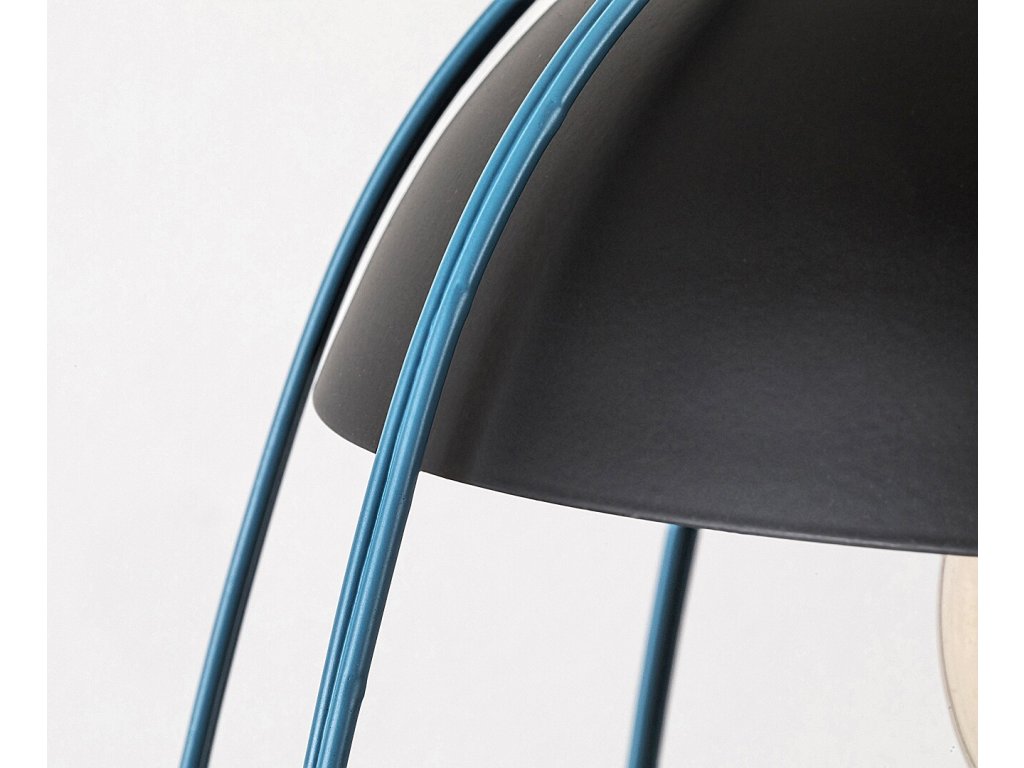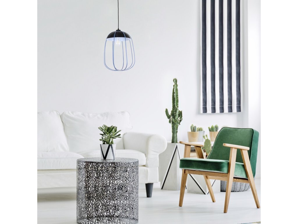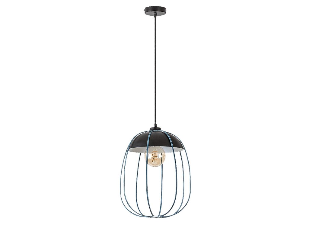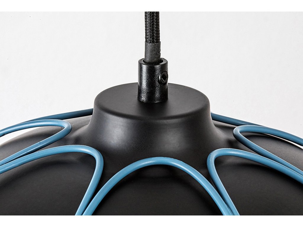 Industriálne závesné svietidlo Svens s jednou päticou E27, ideálne do obývačky. Matná čierna farba lampy a modré tienidlo vytvárajú výrazný dizajn.